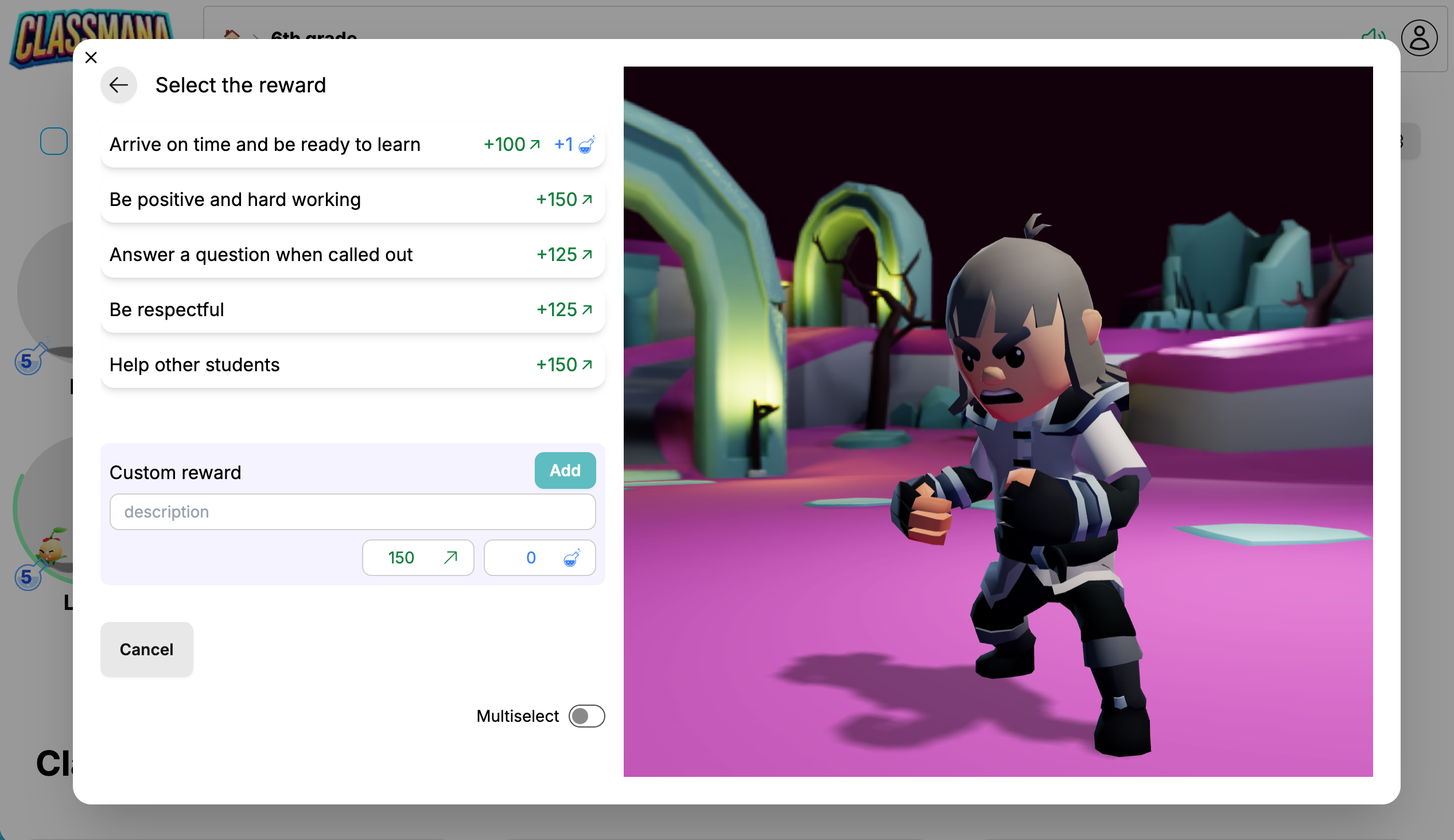 Panel za nagrade radi na isti način - kliknite unaprijed konfiguriranu nagradu ili stvorite prilagođenu. Nagrada će biti primijenjena na sve odabrane učenike.